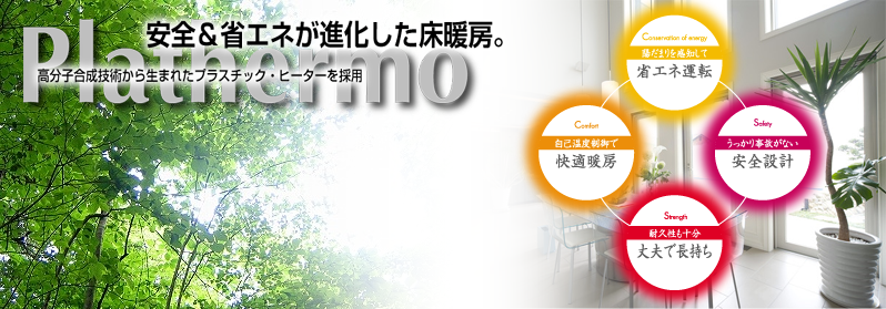 「プラサーモ」は、従来の電熱線に替わり面状プラスチック・ヒーターを用いたPTC電気式床暖房。